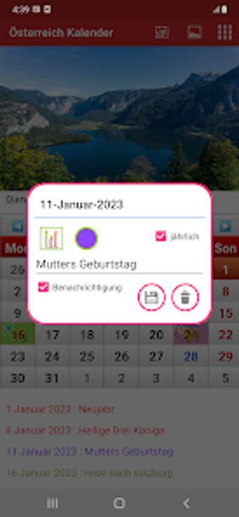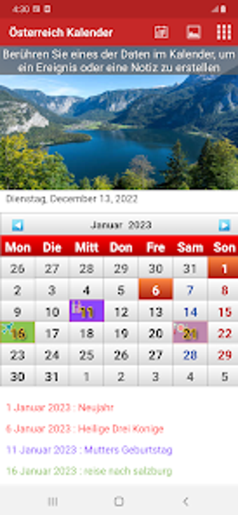De Österreich Kalender 2023 is een veelzijdige en gebruiksvriendelijke applicatie voor Android-gebruikers, ontworpen om de organisatie van persoonlijke en professionele evenementen te vergemakkelijken. Met de mogelijkheid om belangrijke data zoals feestdagen, verjaardagen en huwelijksdata te markeren, biedt deze kalender een handige manier om alles wat belangrijk is in uw leven bij te houden. De app stelt gebruikers in staat om gebeurtenissen en notities toe te voegen, waarbij ze aangepaste symbolen en kleuren kunnen gebruiken voor een persoonlijke touch.